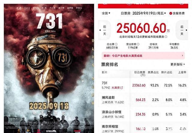 9月19日,星期五,热映电影票房新鲜出炉,总体来看,差距非常大,全天票房最高的是《731》拿下2.34亿,《捕风追影》等电影的全天票房非常菜,还没有《731》全天票房的零头多,被啪啪打脸,没有对比就没有伤害! 9月19日,《731》拿下大满贯,排片占比高达70.2%,全天票房2.33亿,断崖式领跑其他电影,累计票房很快就会突破7亿,有没有被惊艳到?该电影的首轮口碑出炉,反响还不错,很多网友给予好评,认为是一部很优秀的电影。